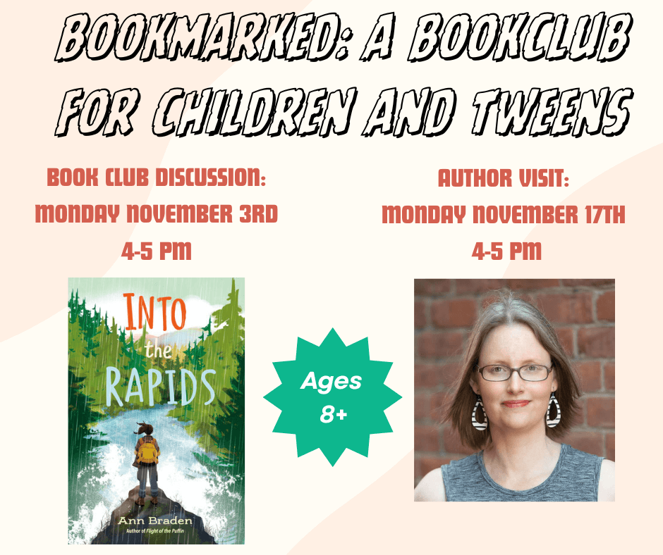 Join us on Monday, November 17that 4 pm to to meet local author Ann Braden! We will talk with her about her latest novel, Into the Rapids. BookMarked is intended for ages 8 and up. Please register at the Children’s Room desk or contact us by phone or email: