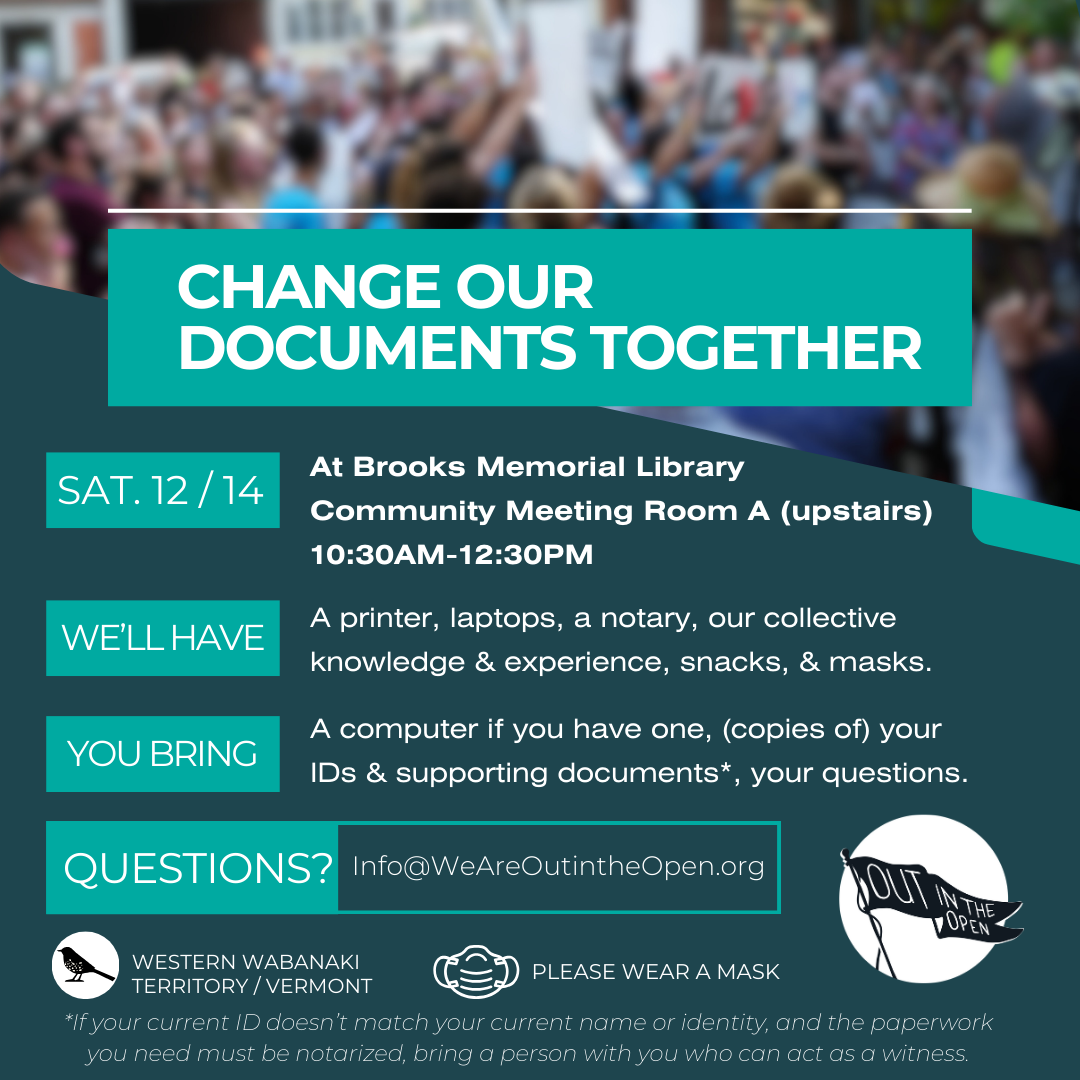 For LGBTQ+ community members needing to change/update identity documents. Join us in Brattleboro the morning of Saturday December 14th from 10:30AM-12:30PM at the Brooks Memorial Library to work on updating/changing your identity documents in community with others (driver’s privilege card, driver’s license, social security card, birth certificate, passport, non-driver ID, name change paperwork, gender marker paperwork, etc.).