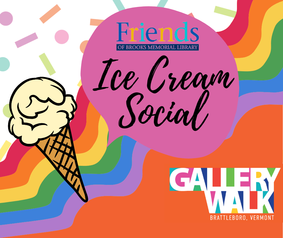 The Friends of Brooks Memorial Library invite you to an old fashioned ice cream social at September's Gallery Walk to celebrate Library Card Sign Up Month. Join us from 5-7pm or until the ice cream runs out! Dairy and vegan options available. Ice cream is by donation.